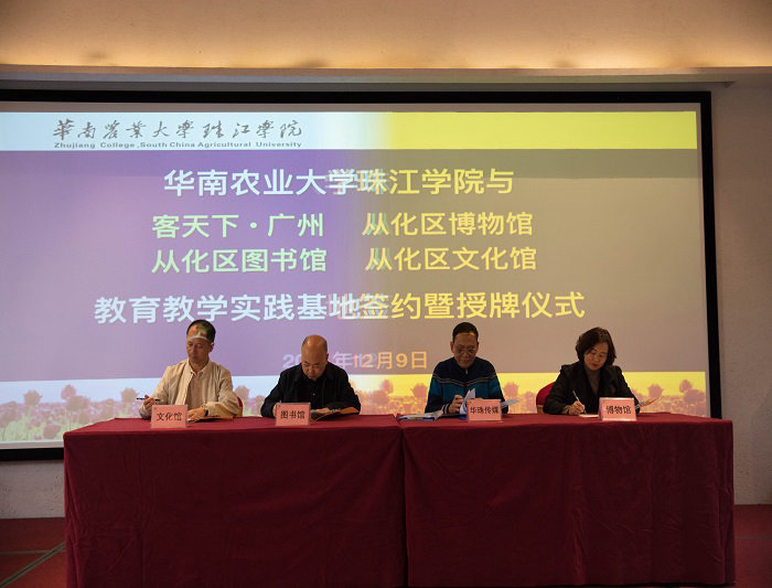 12月9日下午,华南农业大学珠江学院传媒学院与从化区图书馆、区文化馆、区博物馆、鸿客集团广州公司在客天下•广州国际旅游度假区幸福厅举行了教育教学实践基地签约暨授牌仪式(以下各单位简称为“华珠传媒”、“区图书馆”、“区文化馆”、“区博物馆”、“广州客天下”),从化区常委、宣传部部长骆志雄与从化区文广旅体局总工程师申国海莅临指导,从化区图书馆馆长邱跃、区文化馆馆长冯奕华、区博物馆馆长李小梅和华南农业大学珠江学院董事长宫俊全、华珠传媒学院院长梁深洪、华珠传媒学院党总支书记周玲军应邀到场。集团董事长蔡鸿章、广州公司总经理许文、集团董助申晓出席本次仪式。 从化区委区政府、区图书馆、区文化馆和区博物馆代表(左)与华珠传媒团队、客天下团队(右)签约暨授牌仪式现场仪式开始前,骆志雄常委代表从化区委区政府,对本次签约挂牌合作表示高度认可,认为五方共融共建教育教学实践基地,正是回答习近平总书记最关心的“如何将文化传播到每一个地方”这一问题的有力举措。同时,骆志雄常委对未来政校企各方优势互通、共创共赢表达了深切期待,希望广州客天下与区图书馆、区文化馆、区博物馆、华珠传媒着眼高处,“努力做民心相通的传播者,人文交流的促进者,为弘扬全人类的共同价值、推动构建人类共同体作出应有的贡献”,区图书馆、区文化馆、区博物馆作为宣传系统的重要组成部分,也将延续从化区委区政府的服务精神,对口支持高校人才培育需求和企业经营需要。