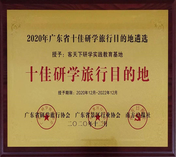 4月23日,客天下研学实践教育基地喜获“广东省十佳研学旅行目的地”及“最具人气研学旅行目的地”荣誉称号!