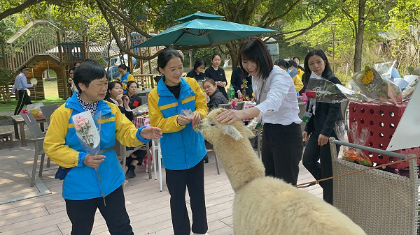 女职工们迎着和煦的春风,在充满春意的美景中一边交流工作与生活,享受惬意的休闲时光,一边拍照打卡,喂食萌宠羊驼,留下此刻幸福的笑颜。
